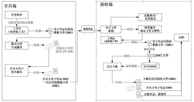 4.接收端试点单位接收电子凭证(含电子凭证结构化数据文件),解析出电子凭证结构化数据文件的结构化数据,然后进行报销、入账等业务处理。